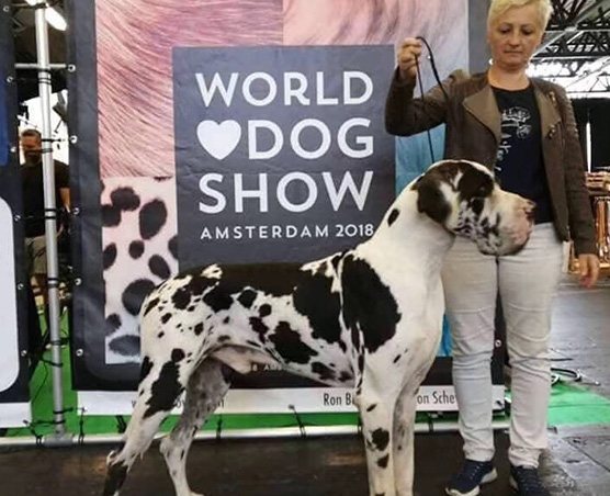 大丹犬(丹麥——布達佩斯)布達佩斯的******犬展,沒有留在現場觀看,但是后來跟犬主聊天,他的寶寶全場******,為你鼓掌。